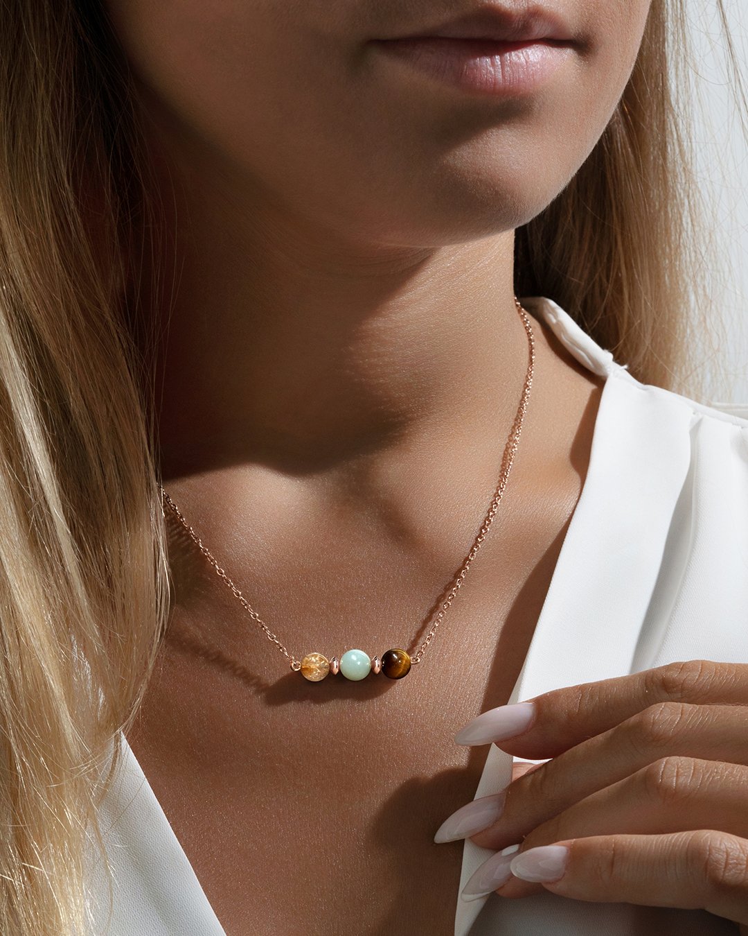 Die harmonische Kombination aus erwärmtem Citrin, Amazonit und Tigerauge steht für ausgeglichene Gefühle, starkes Selbstbewusstsein und sicheren spirituellen Schutz.