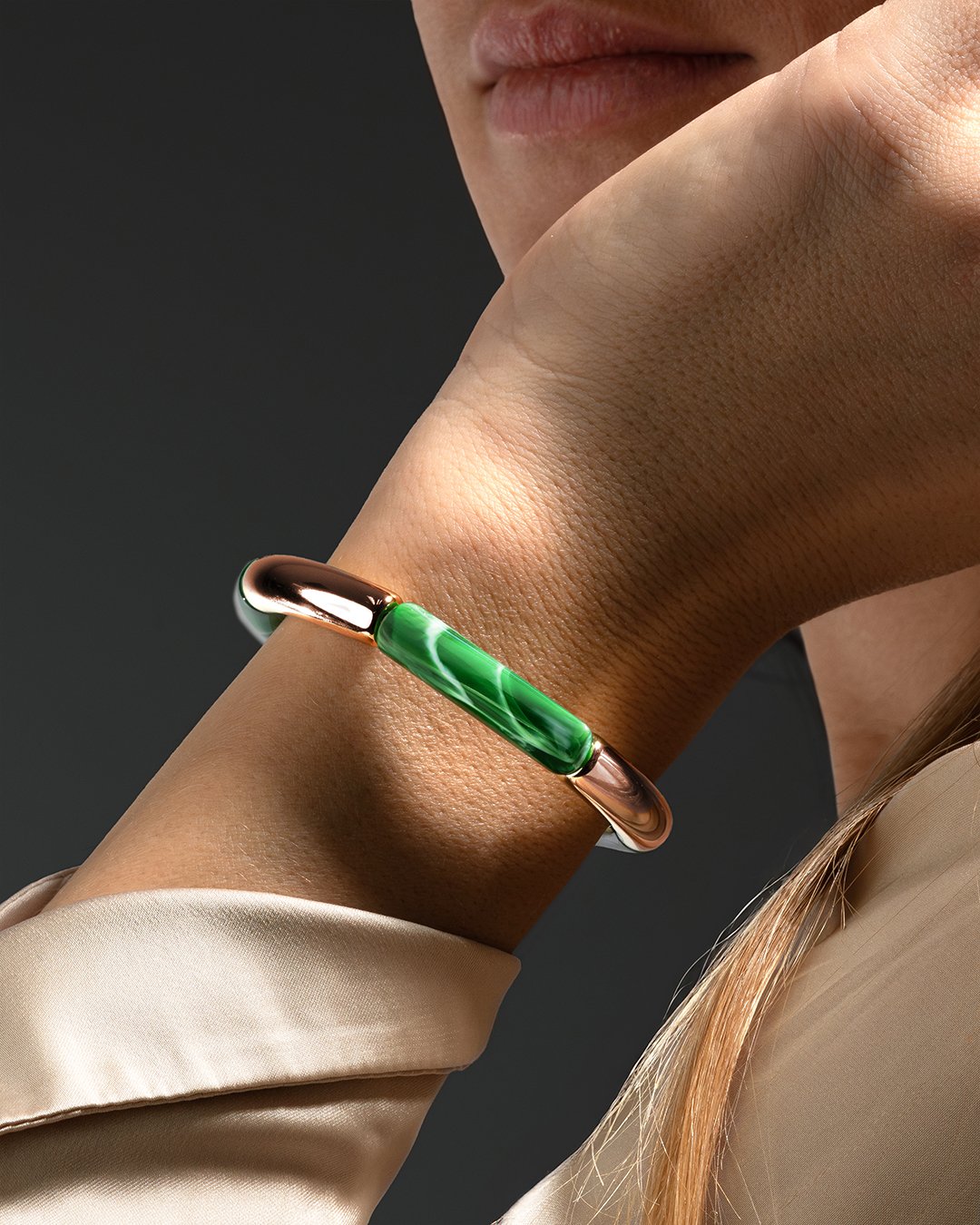 Das Acetat-Armband besteht aus sechs raffinierten Elementen: drei Teile aus marmoriertem Acetat in Celadon-Grün, die eine natürliche und zugleich anspruchsvolle Note verleihen, und drei Teile aus roséfarbenem Edelstahl, die Robustheit und Glanz vereinen. Das zentrale Element, von Hand mit dem Namen Anna Velazia graviert, unterstreicht die Exklusivität und Authentizität dieser Kreation.