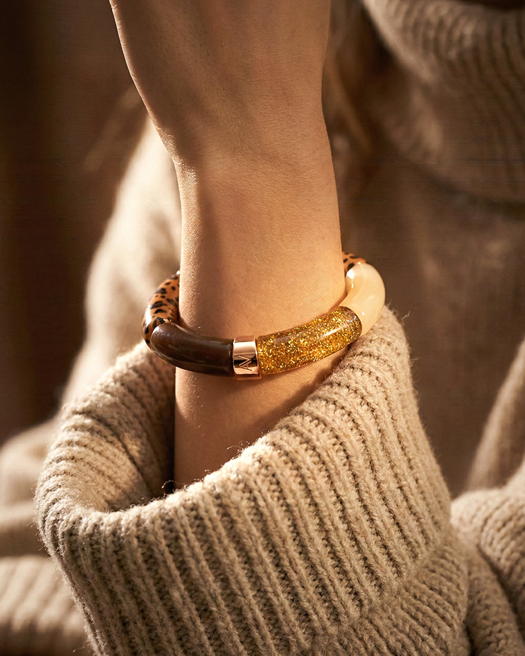 Lassen Sie sich von diesem handgefertigten Acetat-Armband verführen – Symbol für erschwinglichen Luxus und verantwortungsvolle Mode.