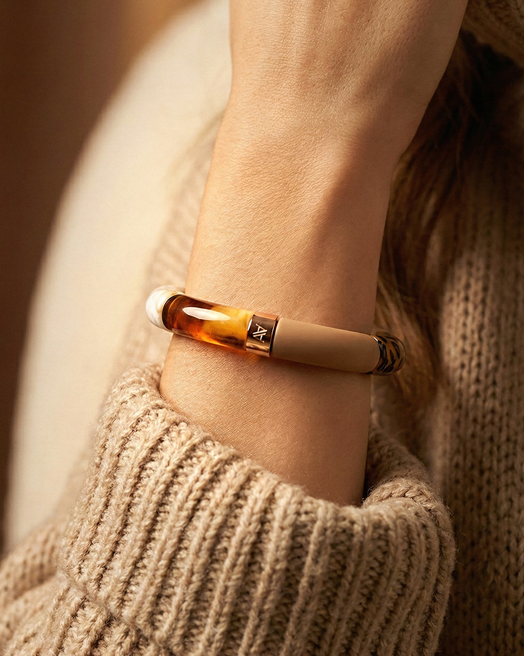 Lassen Sie sich von diesem handgefertigten Acetat-Armband verführen – Symbol für erschwinglichen Luxus und verantwortungsvolle Mode.