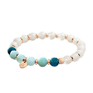 Die natürlichen Perlen werden zart durch rosévergoldete Edelstahl-Zwischenteile mit Feingold getrennt, die die regenbogenfarbenen Töne des Armbands erleuchten. Ein signiertes Anna Velazia Medaillon vollendet diese Kreation mit einer eleganten und spirituellen Note.