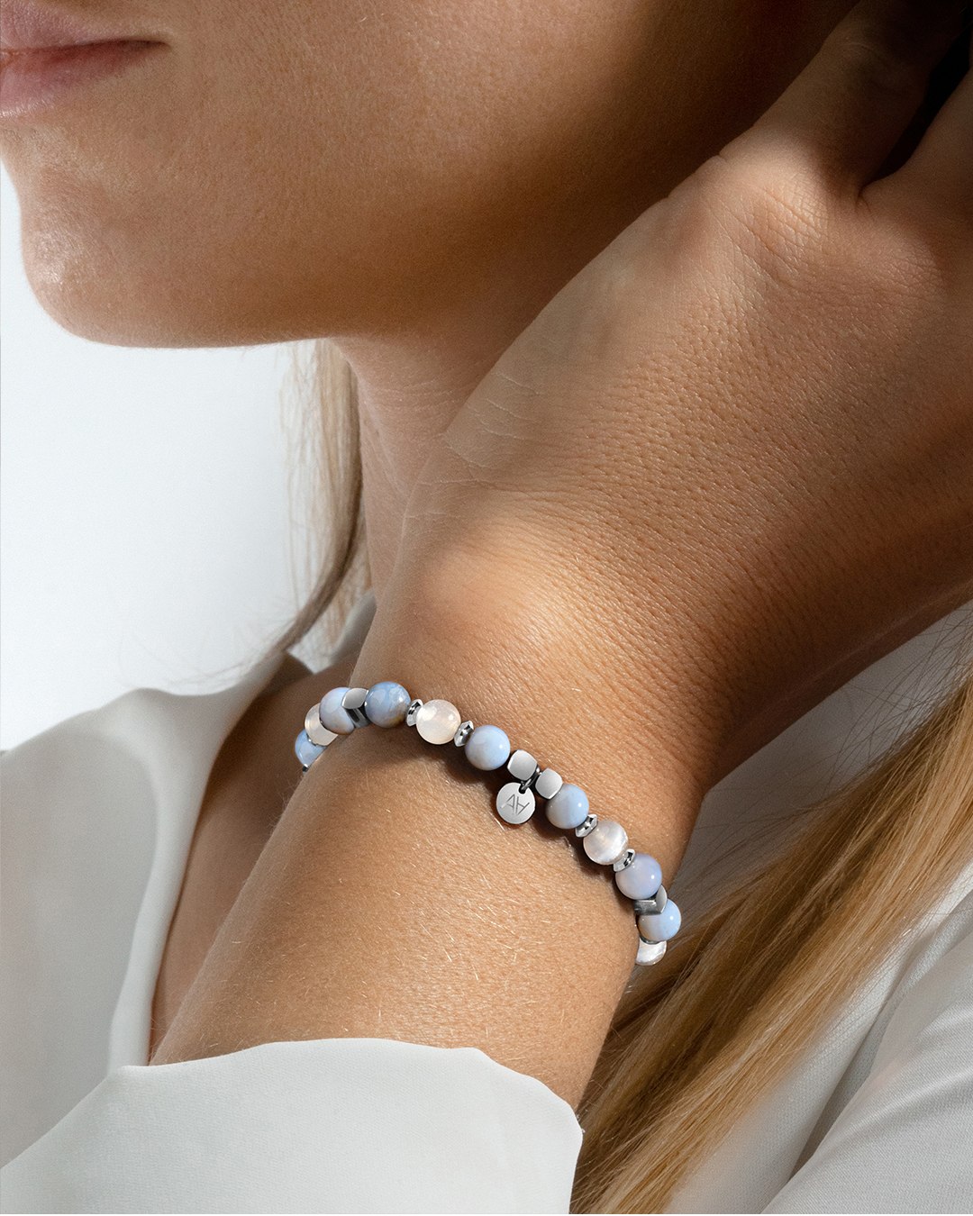 Die symbolische Dimension dieser Verbindung ist beeindruckend. Das Armband symbolisiert die Ruhe der Jungfrau Maria und die Seele des Weisen aus der indischen Tradition, während es gleichzeitig den Zyklus von Geburt, Leben und Tod symbolisiert, für den der Selenit steht.