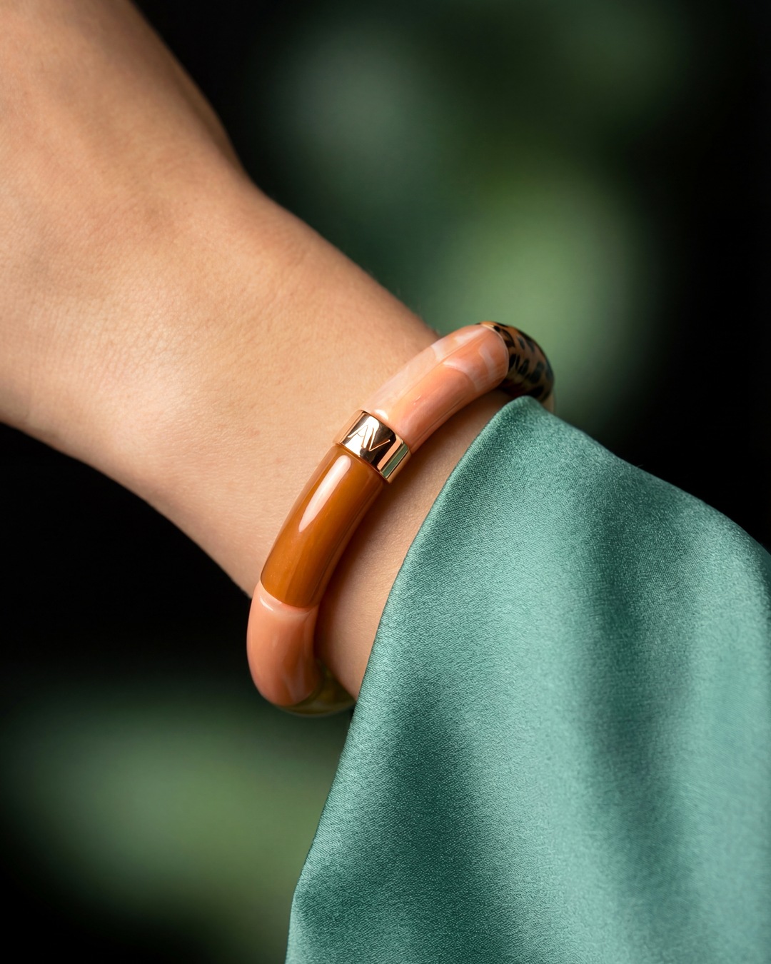 Lassen Sie sich von diesem handgefertigten Acetat-Armband verführen – Symbol für erschwinglichen Luxus und verantwortungsvolle Mode.