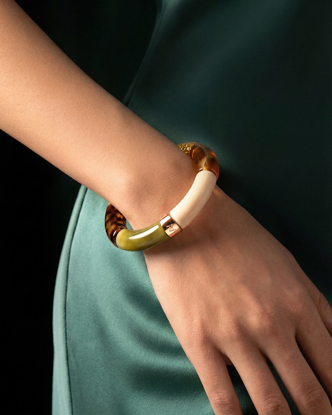 Das Armband besticht durch edle Elemente in satten Grüntönen.