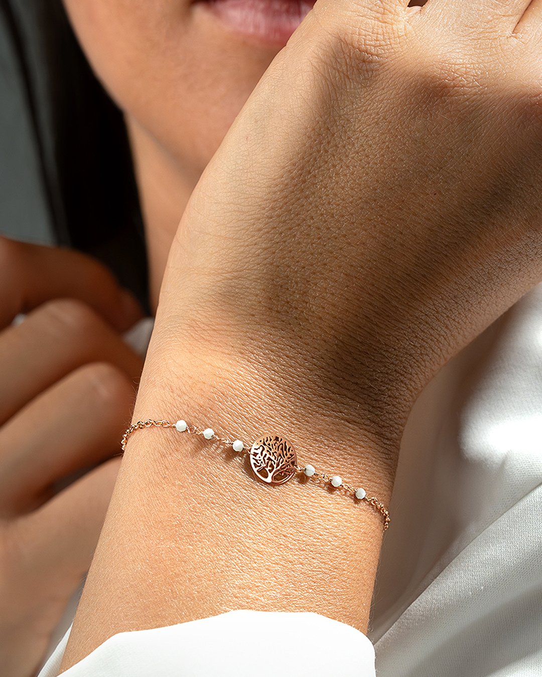 Das Armband Alcati zeichnet sich durch eine elegante Kette aus, die mit sechs kleinen facettierten Howlith-Steinen verziert ist und ein Lebensbaum-Motiv in der Mitte hervorhebt.