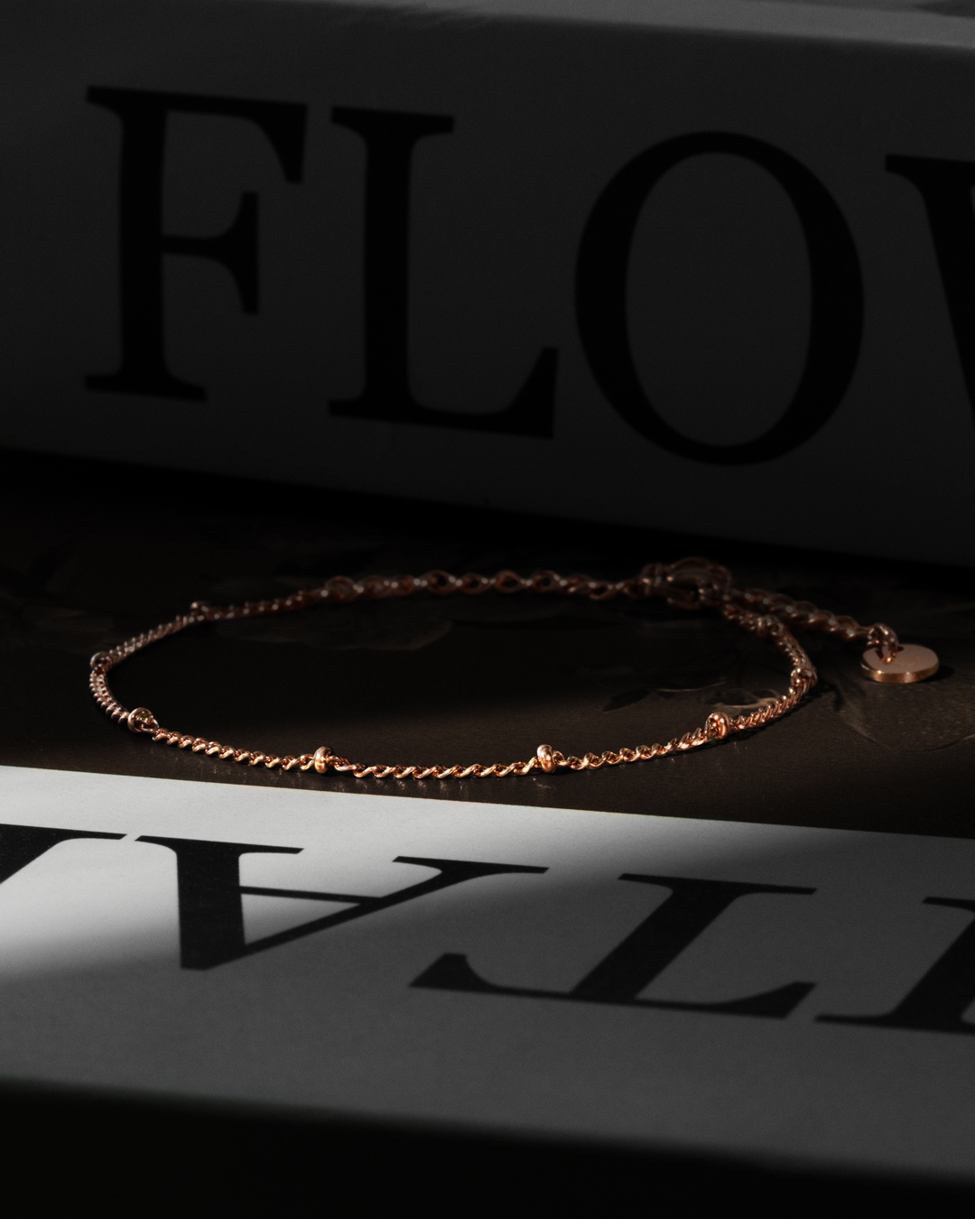 Das Armband Giorgia Rosa ist mit einer eleganten Kette aus kleinen rosévergoldeten Perlen aus Edelstahl versehen. Das Armband hat eine Gesamtlänge von 21 cm und besteht aus einem Hauptteil von 14,5 cm sowie einem verstellbaren Teil von 6,5 cm, der an jedes Handgelenk passt. Dieses Armband ist ein unverzichtbares Accessoire, das perfekt zu allen anderen Armbändern der Marke Anna Velazia passt.