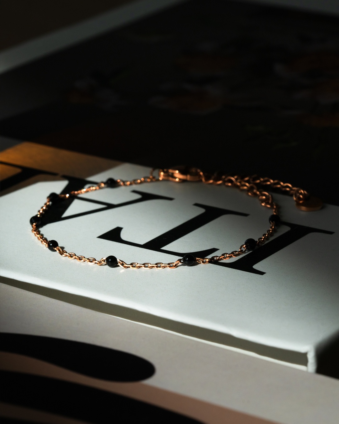 Das Armband Livia Rosa besteht aus einer Kette aus rosévergoldeten Edelstahl, die mit feinen Ornamenten aus schwarzem Emaille verziert ist. Das Armband hat eine Gesamtlänge von 21 cm und besteht aus einem Hauptteil von 14,5 cm sowie einem verstellbaren Teil von 6,5 cm, der an jedes Handgelenk anpasst. Dieses Armband ist ein unverzichtbares Accessoire, das perfekt zu den anderen Armbändern der Marke Anna Velazia passt.