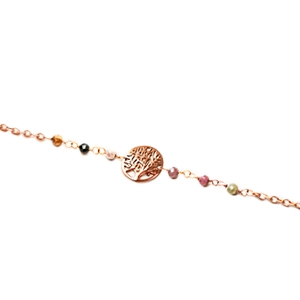 Das Armband Monzato zeichnet sich durch eine elegante Kette aus, die mit sechs kleinen facettierten multicolor-Turmalin-Steinen verziert ist und ein Lebensbaum-Motiv in der Mitte hervorhebt.