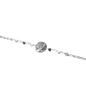 Das Armband Rimito zeichnet sich durch eine elegante Kette aus, die mit sechs kleinen facettierten Rutilquarz-Steinen mit Turmalin-Einschlüssen verziert ist und ein Lebensbaum-Motiv in der Mitte hervorhebt.