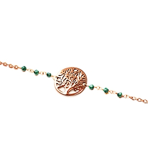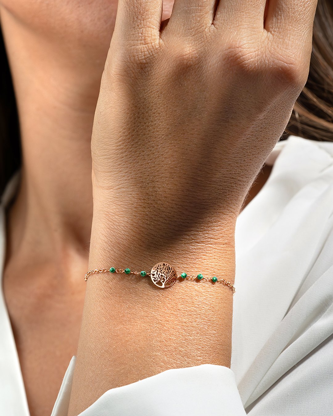 Das Armband Venoti zeichnet sich durch eine elegante Kette aus, die mit sechs kleinen facettierten Malachit-Steinen verziert ist und ein Lebensbaum-Motiv in der Mitte hervorhebt.