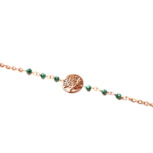Das Armband Venoto zeichnet sich durch eine elegante Kette aus, die mit sechs kleinen facettierten Malachit-Steinen verziert ist und ein Lebensbaum-Motiv in der Mitte hervorhebt.