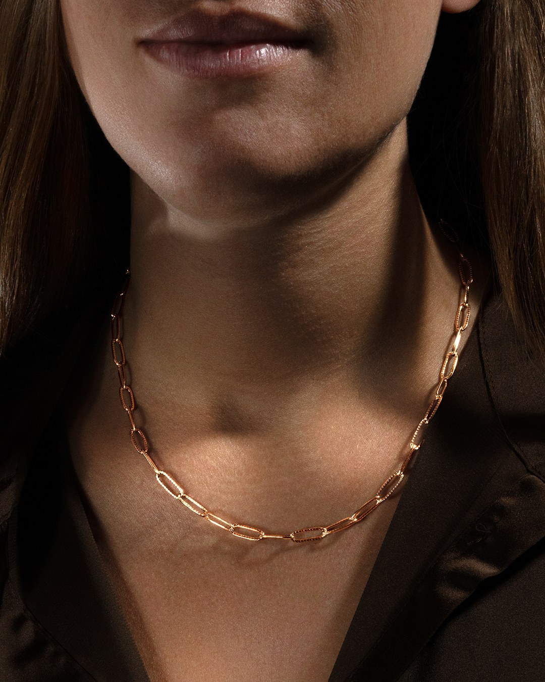 Der Anhänger Gaïana Rosa besteht aus einer Kette mit zierlichen, geschmiedeten Elementen aus roséfarbenem Edelstahl. Dank ihres raffinierten Designs und ihrer Länge von 50 cm kann sie an jedem Glied verstellt werden, so dass sie sich jeder Körperform perfekt anpasst. Die Halskette wird zu einem unverzichtbaren Accessoire, das perfekt zu ihrem Armband und anderen Schmuckstücken der Marke Anna Velazia passt.
