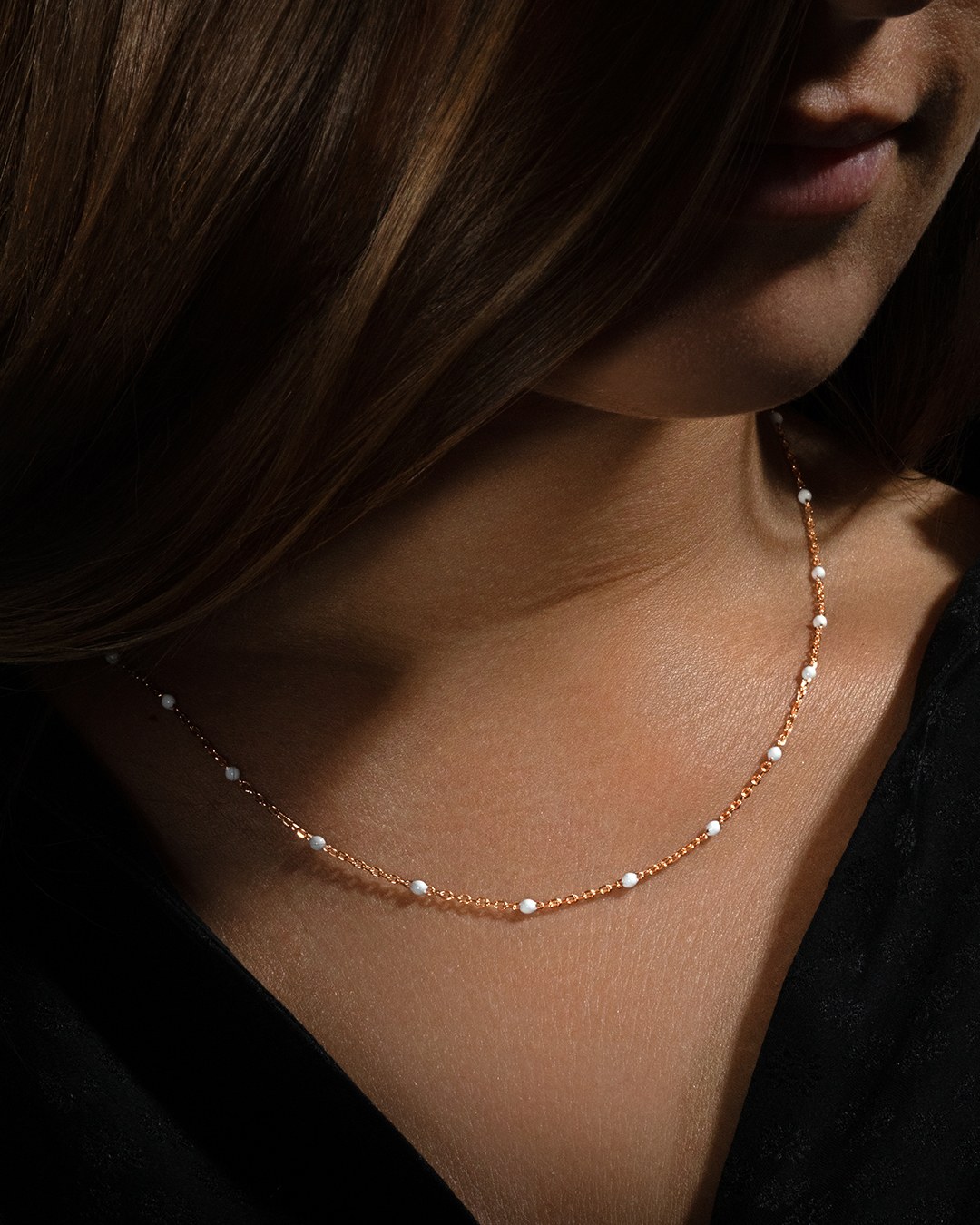 Der Anhänger Lenaya Rosa besteht aus einer roséfarbenen Edelstahlkette, die mit zarten Ornamenten aus weißem Emaille verziert ist. Die Halskette hat eine Gesamtlänge von 50 cm, mit einem Hauptteil von 43 cm und einem verstellbaren Teil von 7 cm, so dass sie sich jeder Körperform anpasst. Diese Halskette wird zu einem unverzichtbaren Accessoire, das perfekt zu ihrem Armband und anderen Schmuckstücken der Marke Anna Velazia passt.