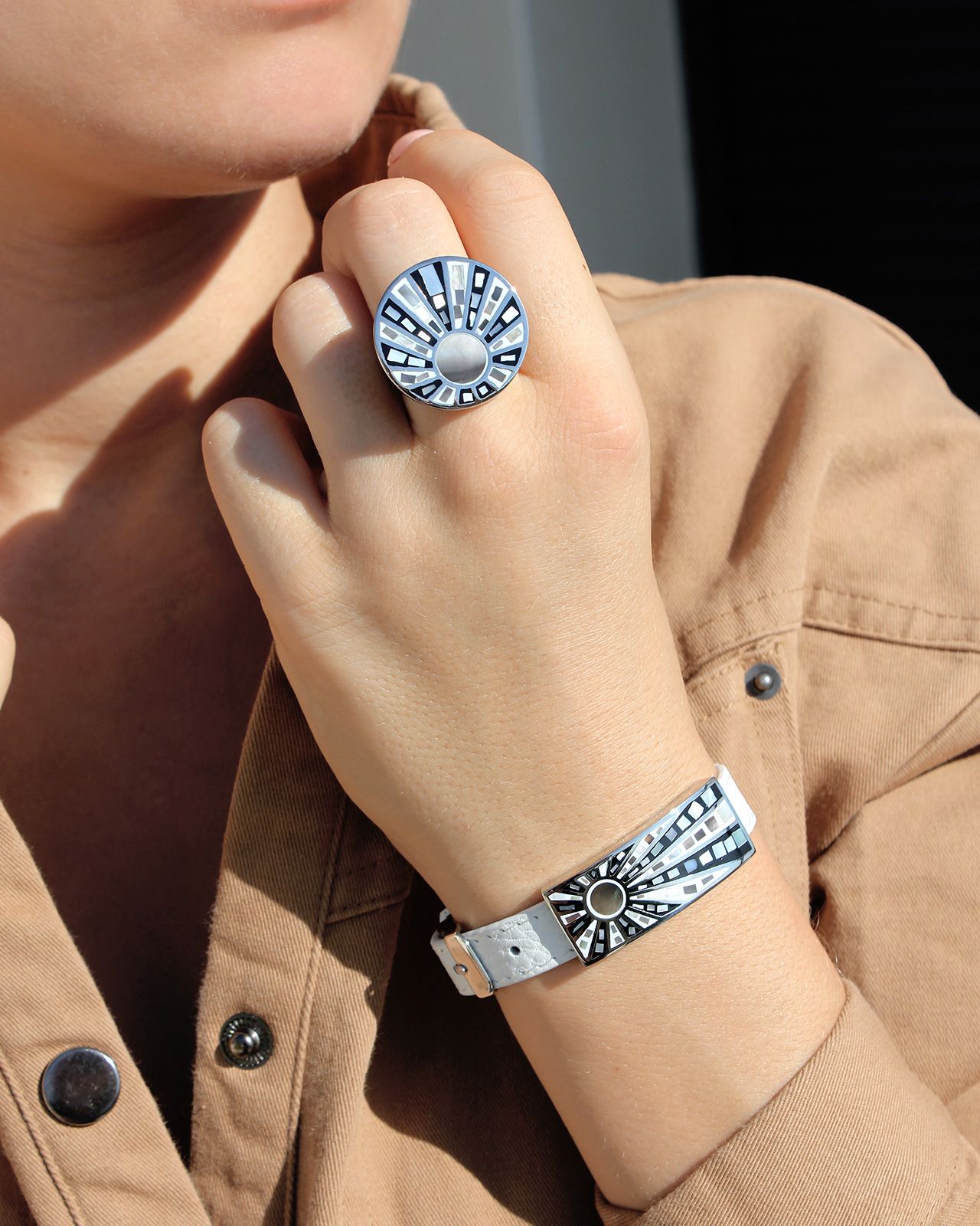 Dieses Schmuckstück begeistert mit einer zauberhaften Sonne, die durch seine schwarz-weißen Nuanzen hervorgehoben wird und es zu einem einzigartigen Schmuckstück machen.