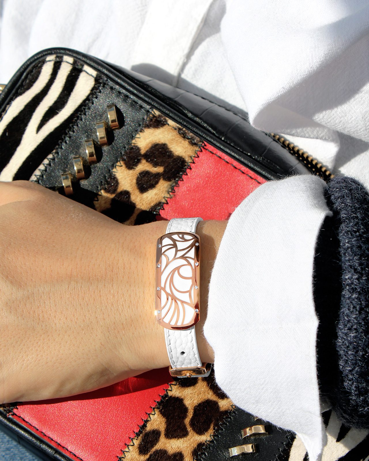 Das Weiß seines Lederarmbands zaubert einen Hauch von Glanz in Ihre täglichen Outfits.