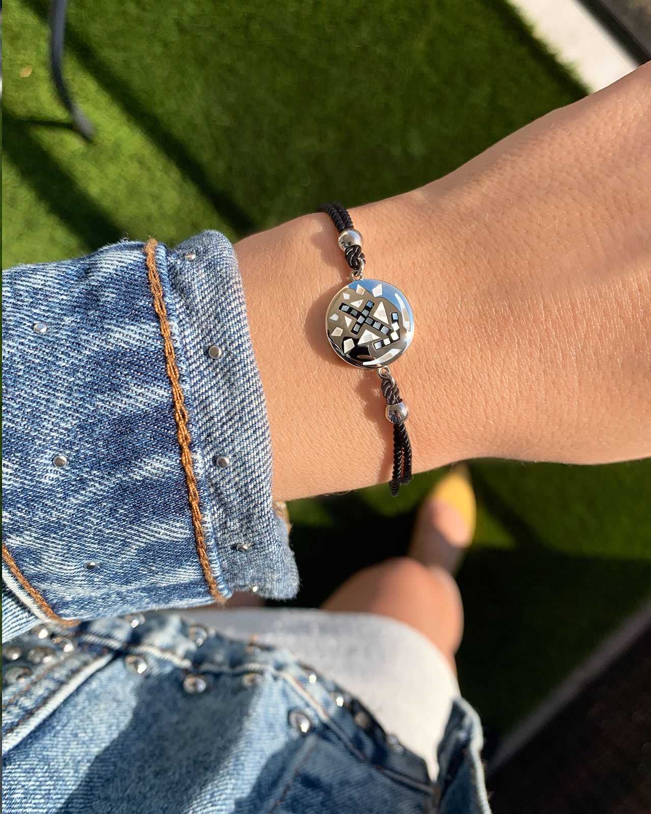 Dieses Schmuckstück mit seinen akribischen Perlmutt Mustern und seiner schwarzen Band aus Baumwolle bietet Ihnen unbegrenzte Möglichkeiten zur Kombination.