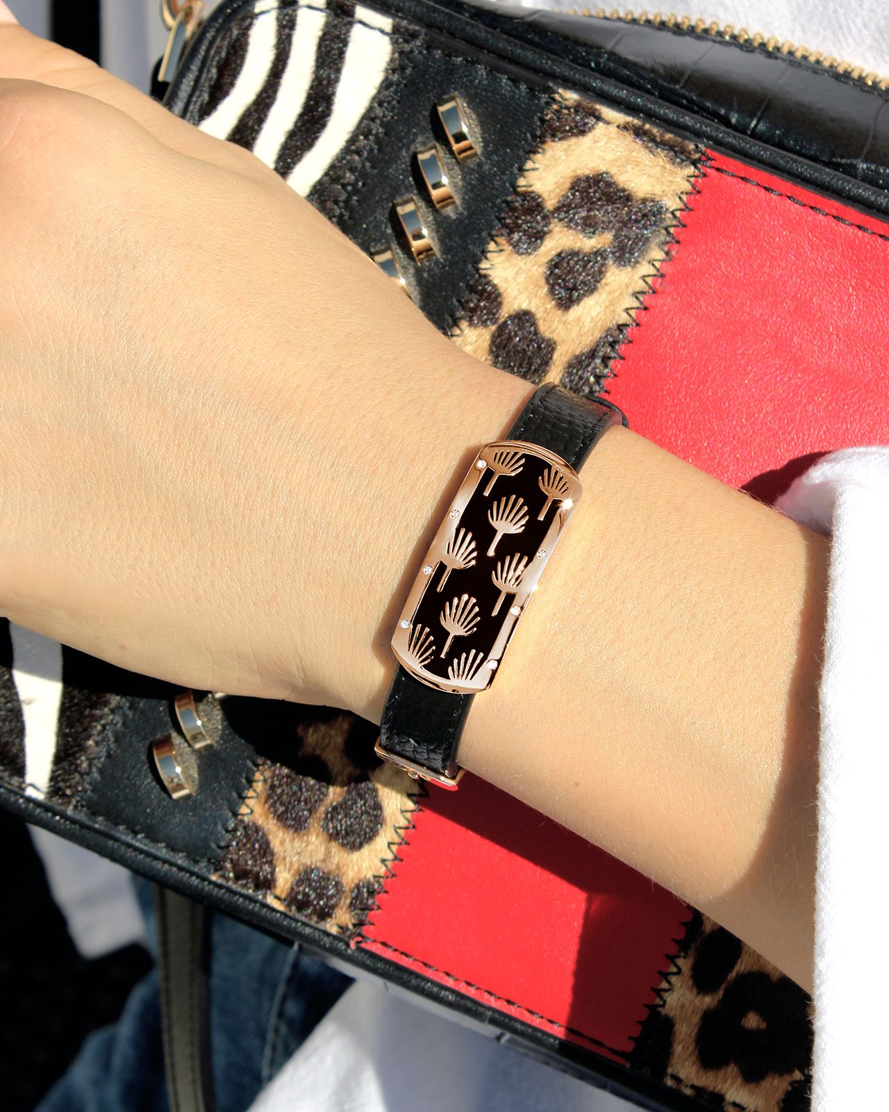 Das schwarze Lederarmband passt hervorragend zu dem goldrosa Edelstahl und macht es zu einem Must-have.