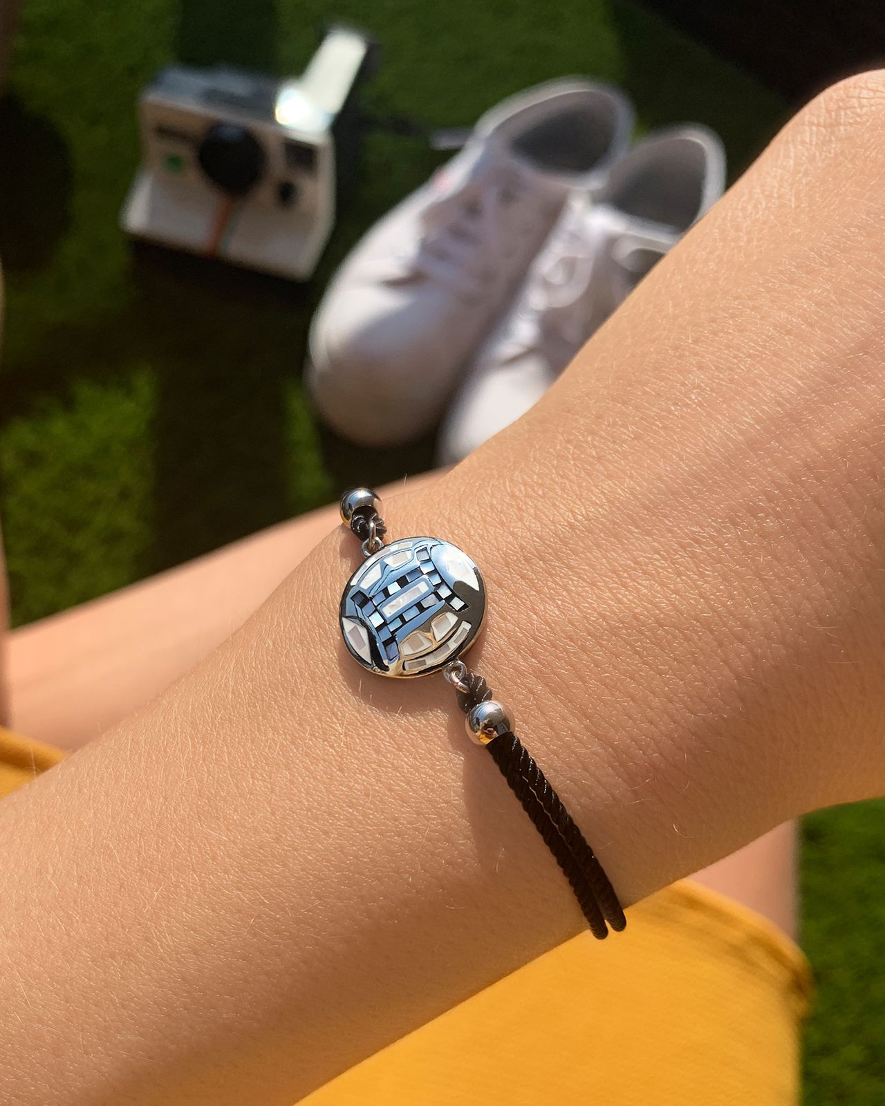 Das Armband Zwillinge ist aus emailliertem Edelstahl und mit Perlmutt besetzt.