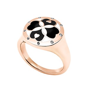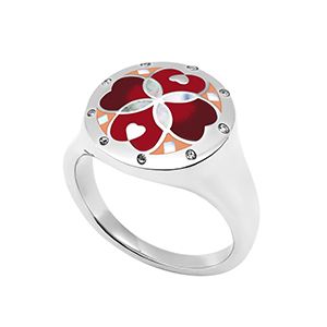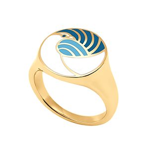 Der Ring Alberina Doro ist aus emailliertem Stahl gefertigt, mit Feingold vergoldet und mit kleinen Diamanten besetzt.