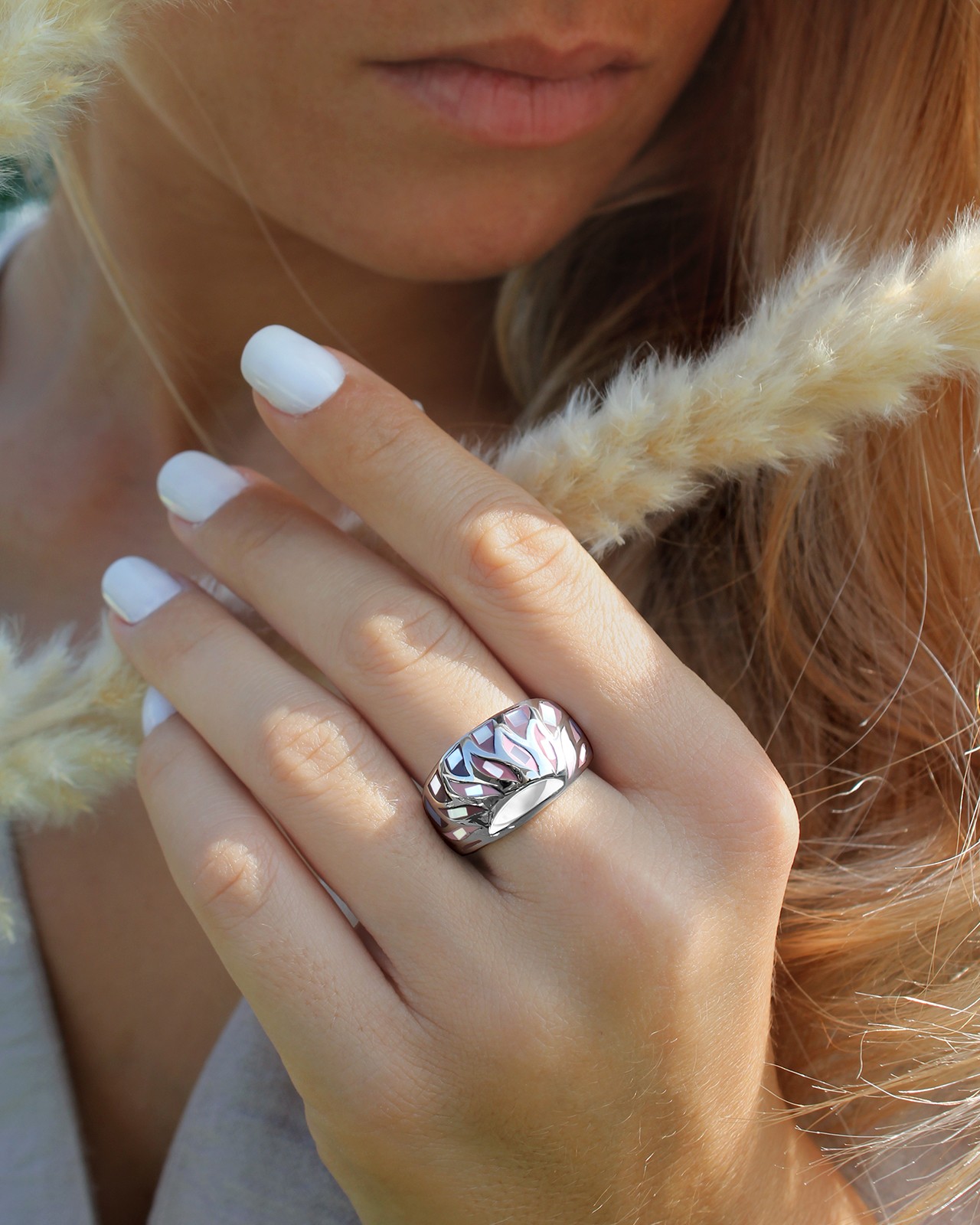 Der Ring Manaroletta ist aus Stahl gefertigt und mit Perlmutt besetzt.