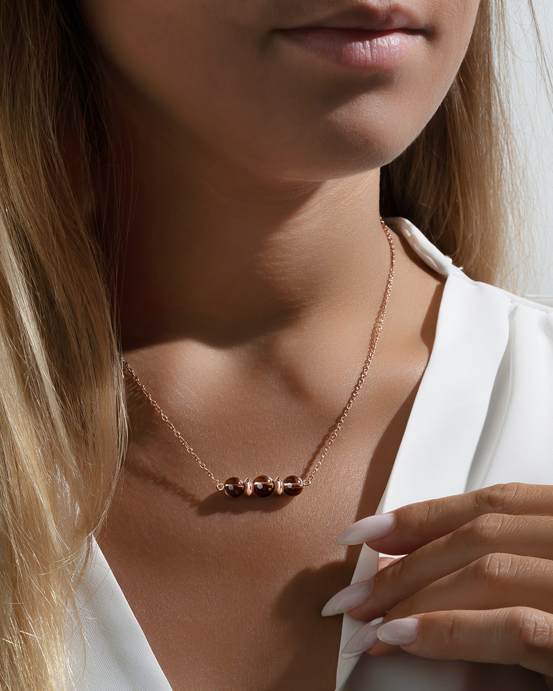 Der Anhänger Catanina besteht aus drei Rauchquarzsteinen, die sorgfältig zwischen zwei Pastillen aus roséfarbenen Edelstahl angeordnet sind.