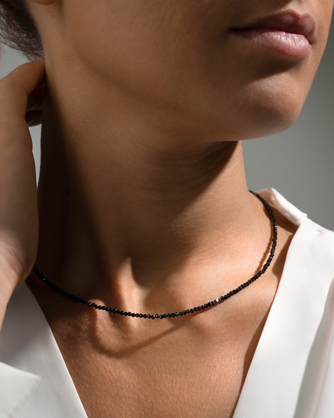 Die Halskette Leona hebt ein zartes Choker-Design hervor, das aus feinen facettierten Schwarzer-Turmalin-Perlen von 2 mm besteht.