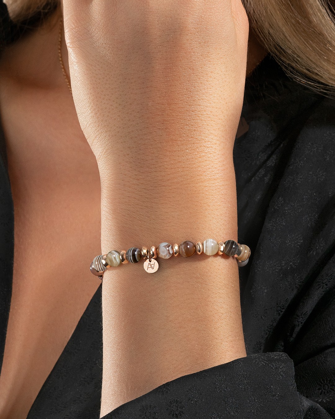 • Material des Armbandes Rosévergoldeter Edelstahl und Botswana Achatstein