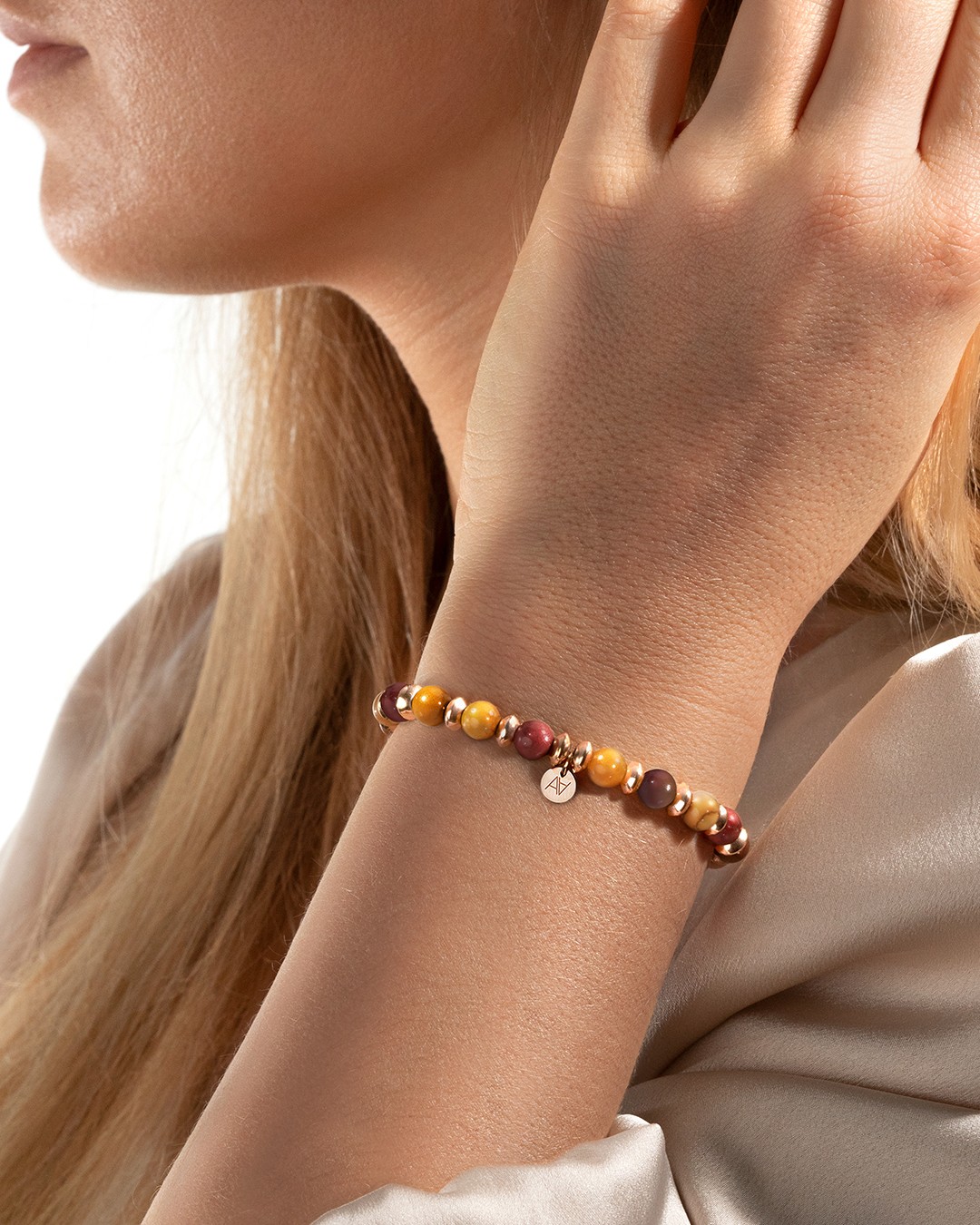 - Material des Armbandes Rosévergoldeter Edelstahl und Mokkaite-Japisstein