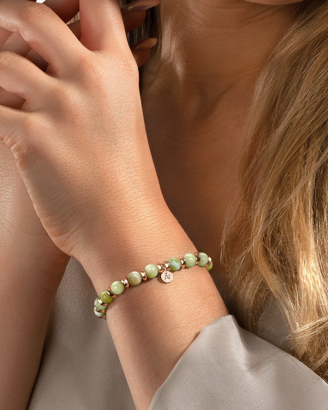 - Material des Armbandes Rosévergoldeter Edelstahl und Peridot-Jade-Stein