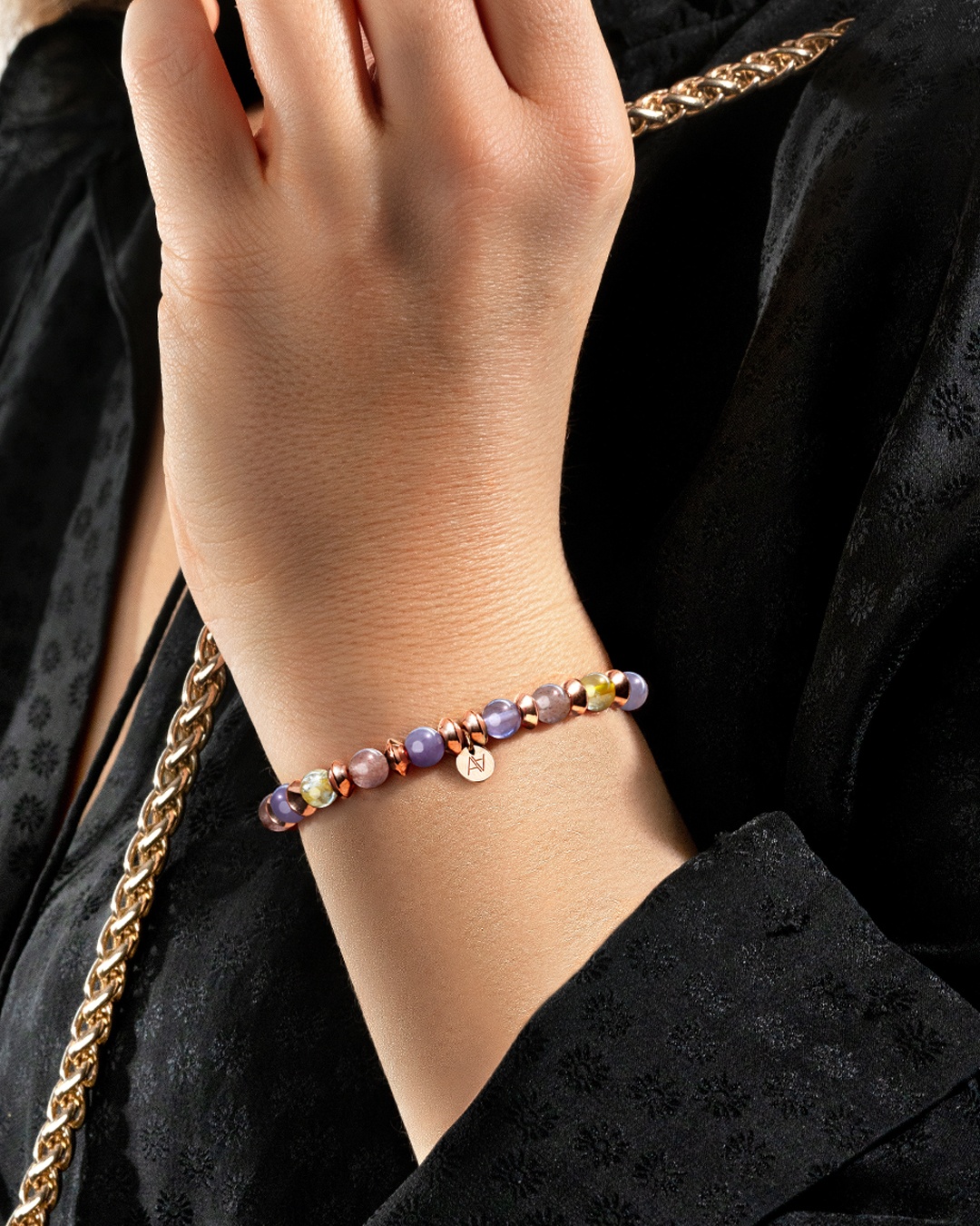 Das Armband Salento ist aus einem Super Seven Naturstein gefertigt. Das Herzstück ist ein von Anna Velazia entworfenes, rosévergoldetes Plättchen aus Edelstahl, das Ihrem Handgelenk einen Hauch von Farbe verleiht. In der Lithotherapie wird dem Super Seven, der auch als Melody Stone bekannt ist, eine schützende und heilende Wirkung zugeschrieben. Er hilft auch, Ängste zu lindern und hat daher eine beruhigende Wirkung. Unsere Schmuckstücke bestehen aus natürlichen Steinen, die alle unterschiedlich sind. Daher kann es bei jedem Modell zu Abweichungen in der Größe und den Farbnuancen kommen. Es sind diese Unterschiede, die jeden Stein einzigartig machen. Die Anzahl der Steine kann von einem Armband zum anderen variieren.