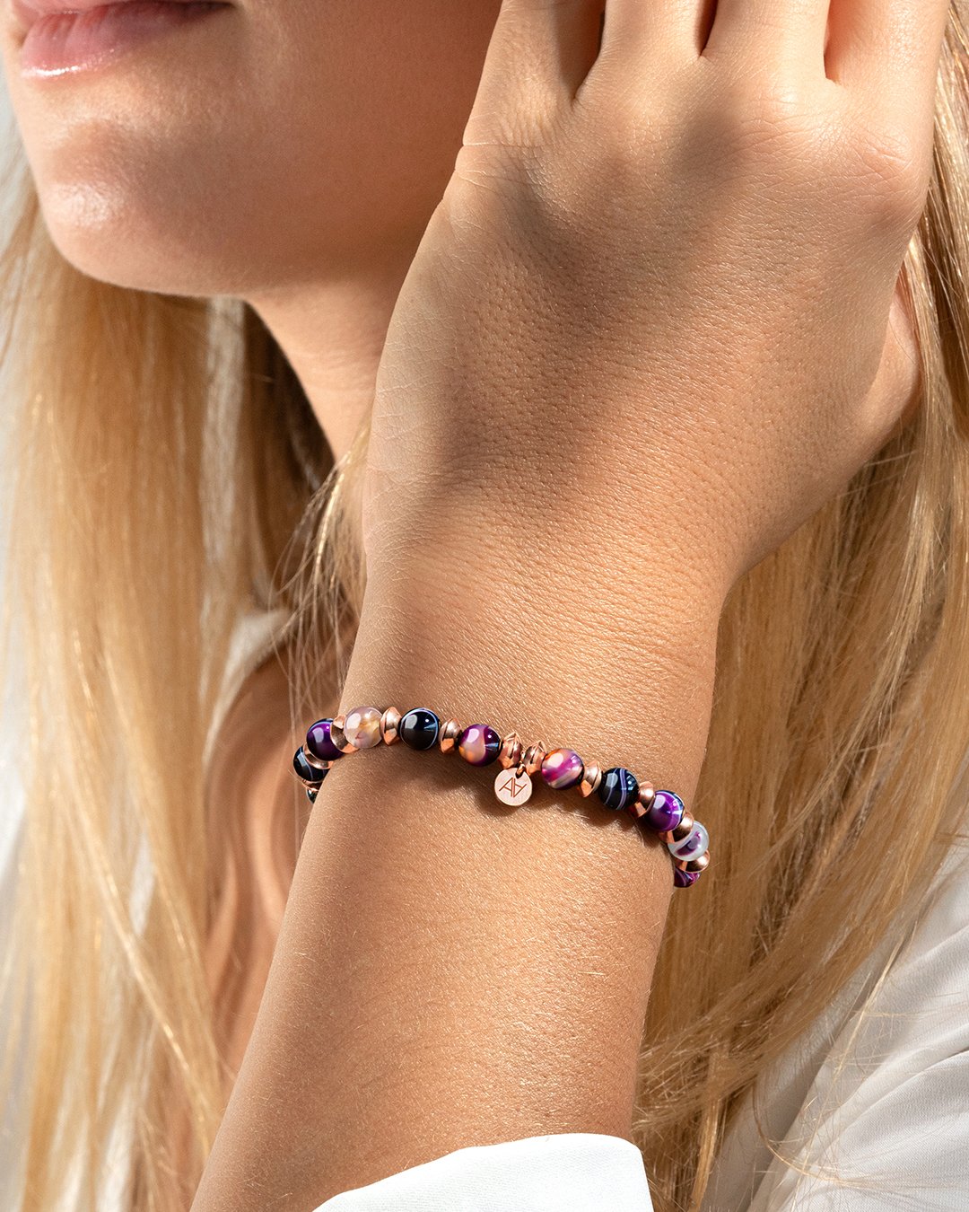 - Material des Armbandes Rosefarbener Edelstahl und achatsteinen violetten