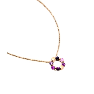 Das Armband Porpora besteht aus einer zarten rosévergoldeten Edelstahlkette, die in der Mitte von einem floralen Motiv aus violettem Achat veredelt wird, verflochten mit einem gehämmerten Ring aus roséfarbenem Edelstahl.