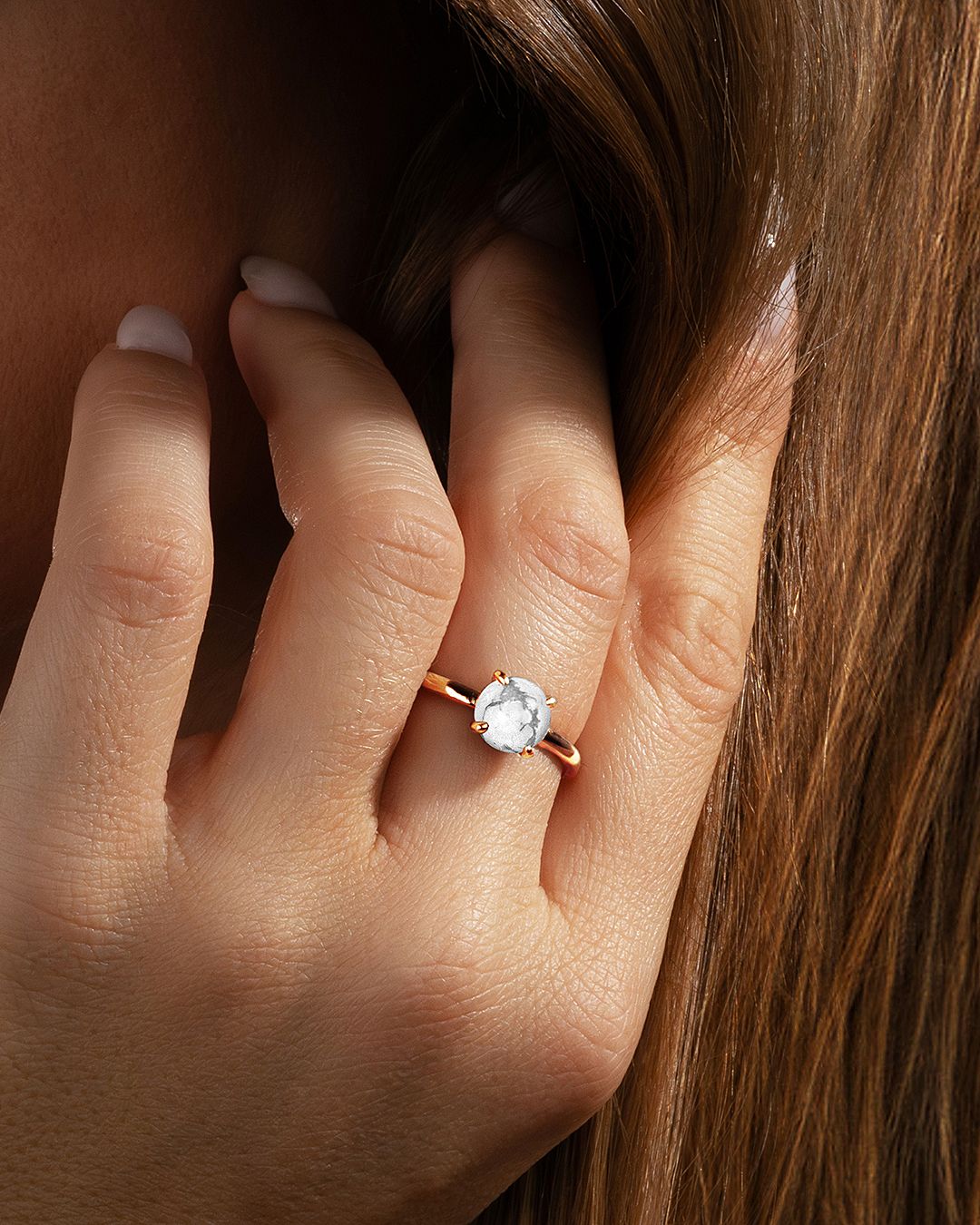 Der Alcamia-Ring, verziert mit einem prächtigen Howlith-Stein, wird durch eine Fassung aus roséfarbenem Edelstahl, gehalten von vier eleganten Krappen, wunderschön zur Geltung gebracht.