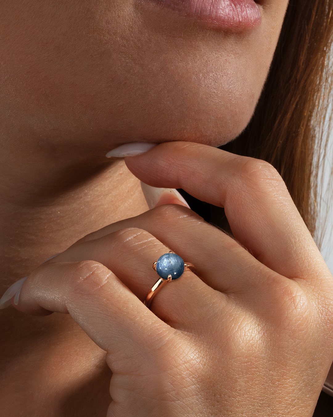 Der Siennia-Ring, verziert mit einem prächtigen Kyanit-Stein, wird durch eine Fassung aus roséfarbenem Edelstahl, gehalten von vier eleganten Krappen, wunderschön zur Geltung gebracht.