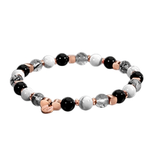 Die Kombination von Rutilquarz, Howlith und Onyx erinnert an einen harmonischen Tanz zwischen Himmel und Erde und bietet eine Synergie aus Energien, die für tiefe Verwurzelung sorgen und gleichzeitig das geistige oder seelische Wohlbefinden stärkt.