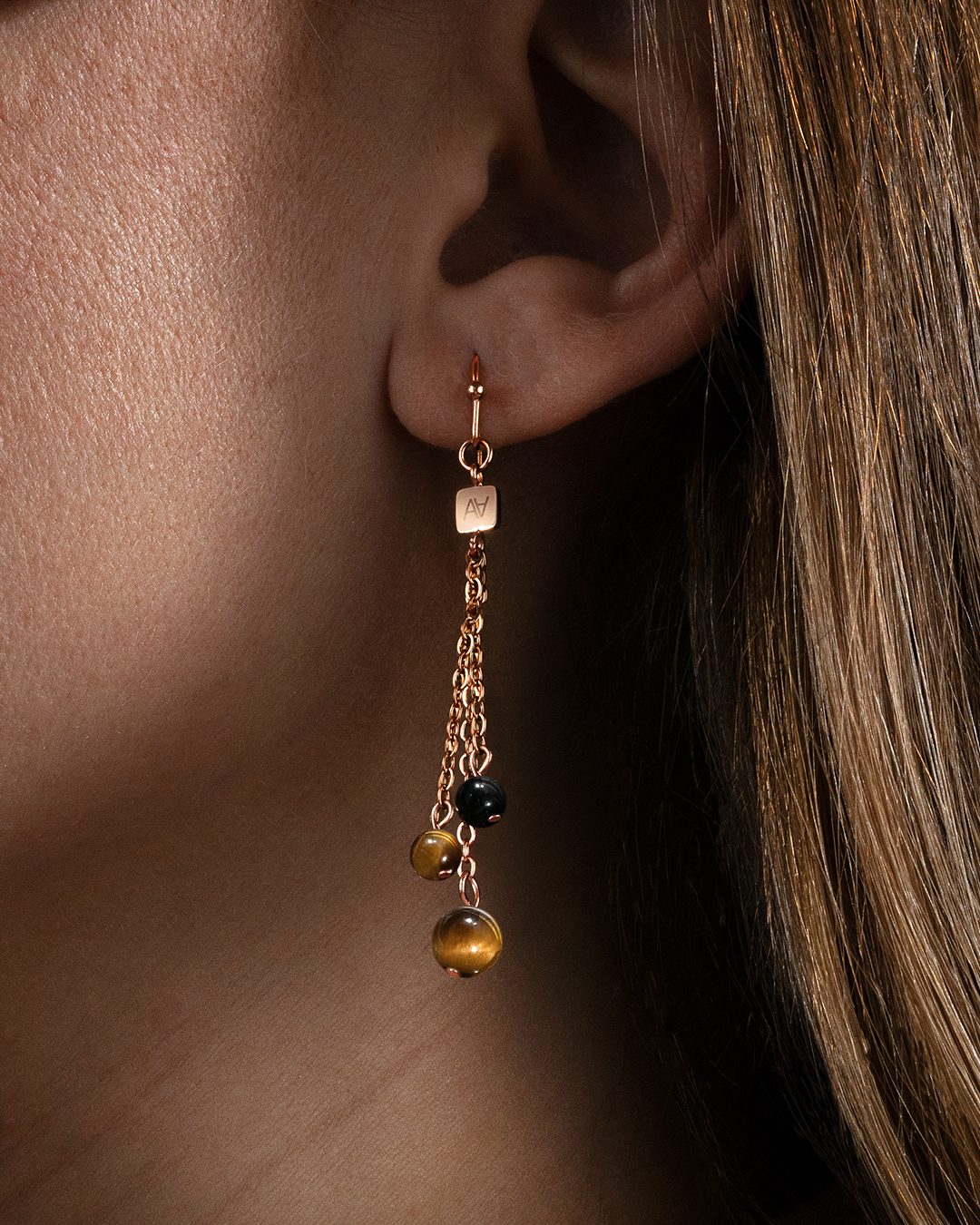 Die Ohrringe "Schutz" sind mit einem 6 mm Tigerauge sowie zwei 4 mm Steinen verziert: einem aus Tigerauge und dem anderen aus Onyx.